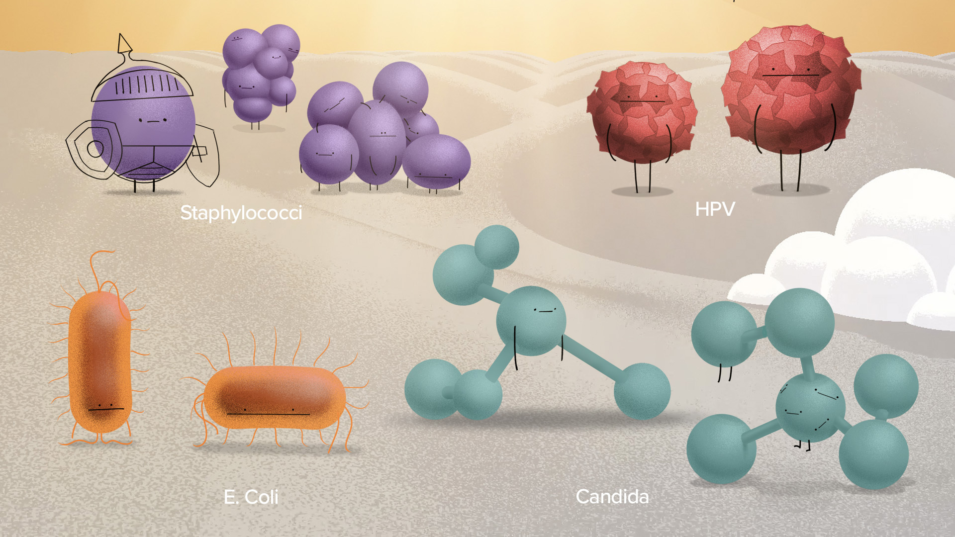 Our solution was to design a cast of simplified germ characters - friendly foes. Each design was subtly informed by the shapes, structures, and behaviours of real microbes, but intentionally abstracted. This allowed the threat to be communicated clearly, while keeping the visuals approachable, memorable, and easy to interpret.